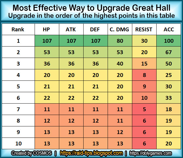 - Other than these considerations the best way to upgrade your Great Hall in RAID is to follow my "Efficiency Points" table.